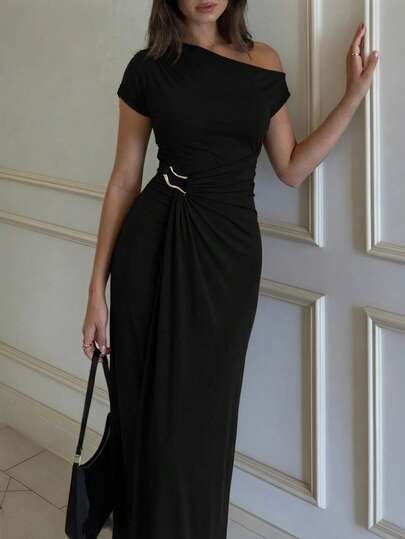 Chocolate Brown Asymmetric Neck Maxi Dress | Ruched Waist Metal Detail Dress For Date & Event Black