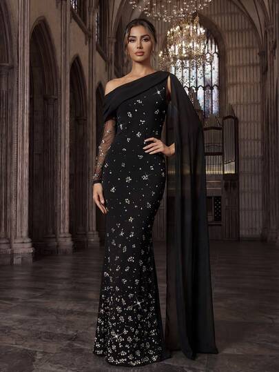 Classy Luxurious Rhinestone Party Formal Dress Diamond Hot Drill Cocktail Dinner Evening Gown Solid Color Asymmetrical Neck Long Sleeve Maxi Dresses - Black - View 1
