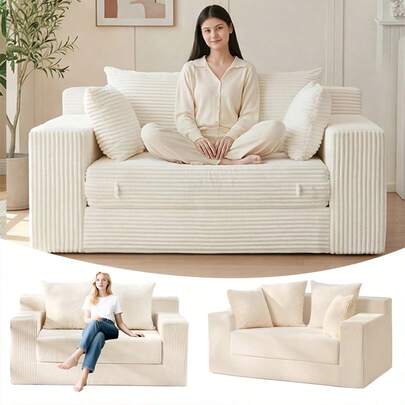 Loveseat Boneless Convertible Sofa Bed, Folding Floor Futon Sleeper Sofa Couch Bed- Boneless Foldable Couch, Corduroy Pull Out Sofa Bed With 4 Pillows For Living Room & Bedroom, Beige