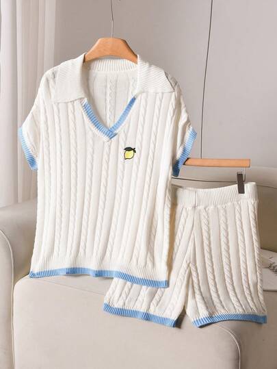 CosyJoli Plus Size Casual Minimalist Blue & White Lemon Print Collar Knit Top And Pants 2 Pieces Set, Lightweight For Spring/Summer - White - View 1