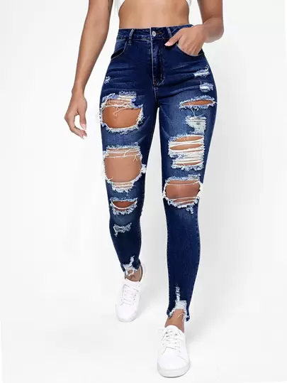 SHEIN Essnce Skinny Jeans Utskuren Slitna Sömnlösa Benslut - Mörktvätt - Visa 1
