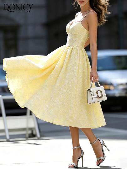 DONICY Sweetheart Neckline Floral Jacquard Mid-Length Dress, Romantic Light Yellow Strap Vintage Dress, Pleated Bustier Design, Suitable For Summer Vacation