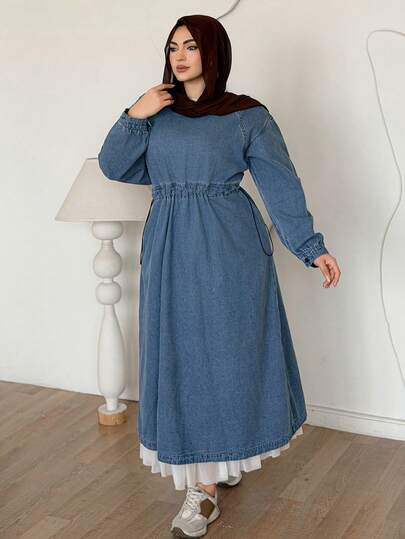 Dazy Plus Enfärgad retro casual lång denimkjol, midja åtsittande, casual plus size damklänning med lång ärm, vår och höst - Mediumtvätt - Visa 2