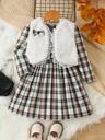 Unga tjejer 2st set stickad långärmad topp & manchesterblomma Pinafore-klänning Casual outfit, höst/vinter