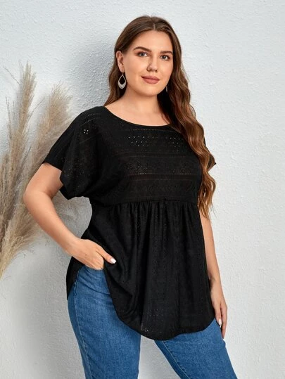 EMERY ROSE Plus Eyelet Embroidery Batwing Sleeve Peplum Tee - Black - View 1