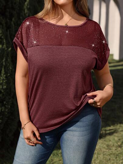 EMERY ROSE Plus Size Women's Round Neck Batwing Short Sleeve Casual Sequin Patchwork T-Shirt, Spring/Summer - Redwood - View 1