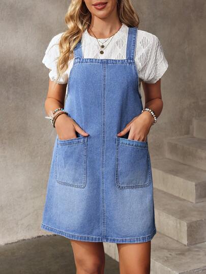 EMERY ROSE Damklänning i tvättad denim med dubbla fickor, avslappnad passform - Blå - Visa 1