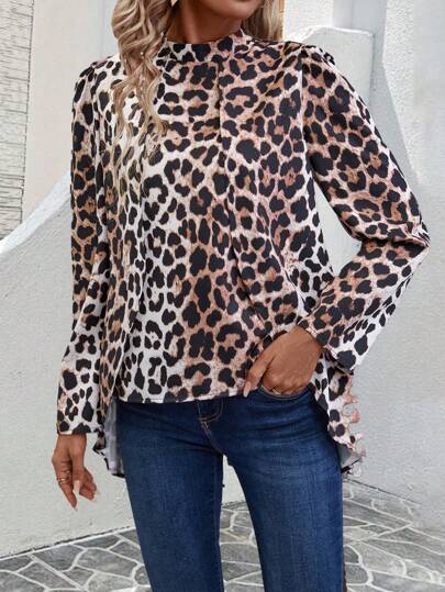 EMERY ROSE Women's Stand Collar Long Sleeve Leopard Print Asymmetric Hem Fashion Blouse - Khaki - View 1