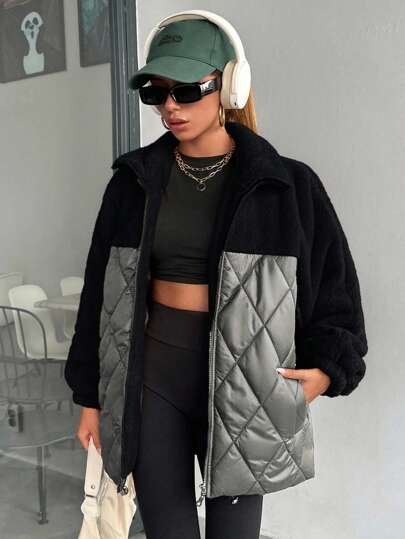 Women Padded Coat With Teddy Bear Fabric Patchwork, Diamond Shape Stitch Line