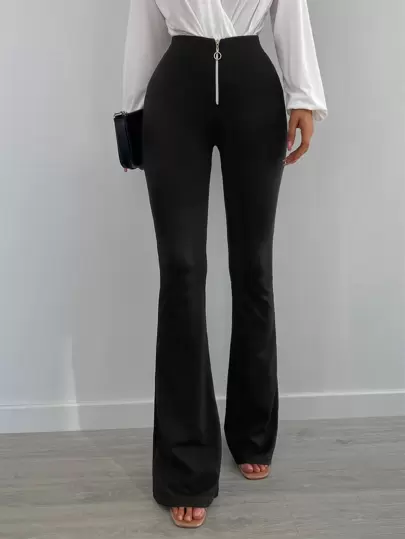 EURMUSE O-Ring Zip Front Flare Leg Pants - Black - View 1