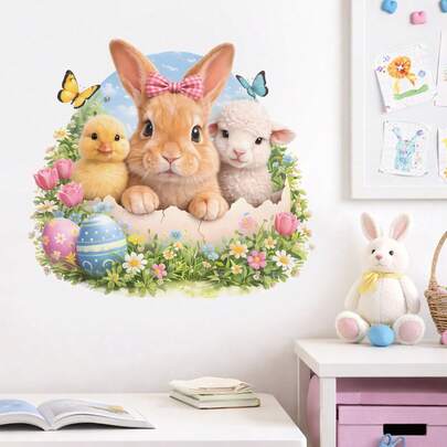 Easter Butterfly Floral Bunny Wall Stickers, Cartoon Animal Self-Adhesive Decals For Living Room Bedroom Entrance, Holiday Decor Essentials - Easter Egg Rabbit - View 1