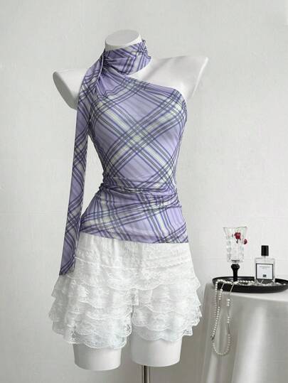 Elamini Damblus med asymmetrisk halsringning, ärmlös blå rutig halterneck och böljande chiffong för sommarsemester, casual - Mauve Lila - Visa 1
