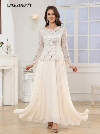 Elegant Apricot Sequin Beaded Long Sleeve Embroidered Dress, Chiffon Skirt, Suitable For Mother Of The Bride, Party, Prom, Wedding And Other Occasions