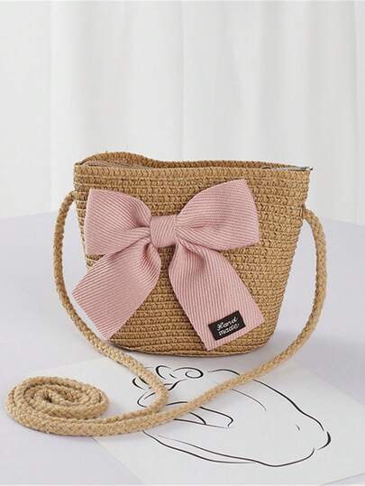 Elegant Beige Straw Crossbody Bag With Large Bow - Woven Texture, Zipper Closure, Suitable For Beach Vacation, Wedding, And Summer Outing, Beach Bag