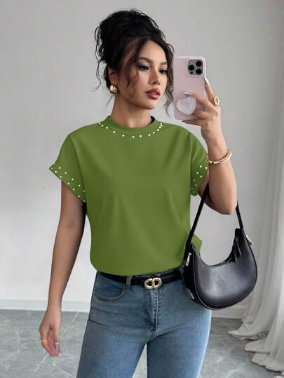 Elenzga Svart rundhalsad kortärmad t-shirt med bubbelpärlor för kvinnor - Grön - Visa 1