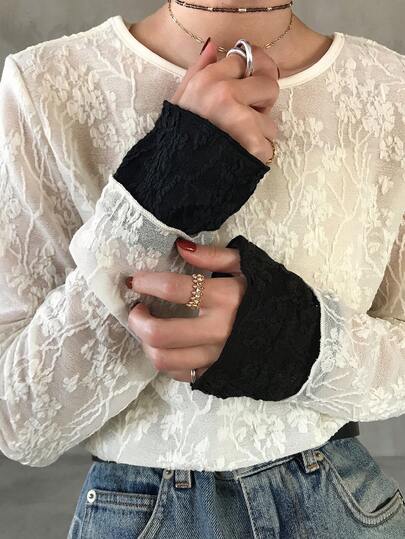 FRIFUL Women's Contrast Color Round Neck Long Sleeve Sheer Lace Overlay Casual Versatile Top, Autumn/Winter