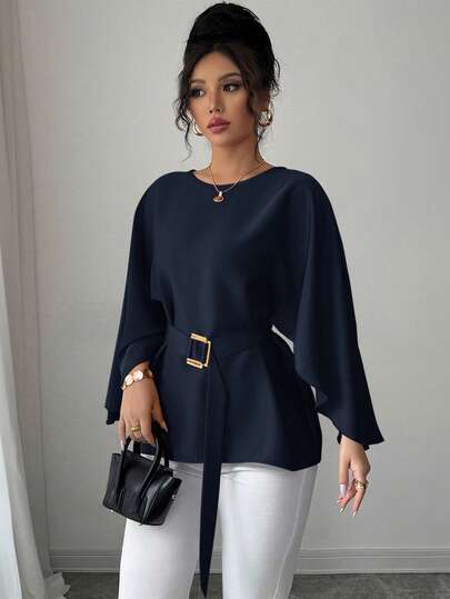 Selianne Damblus i fransk stil med rund halsringning, fladdermusärm och knytband i midjan, glansigt röd, vår/sommar - Marinblå - Visa 1