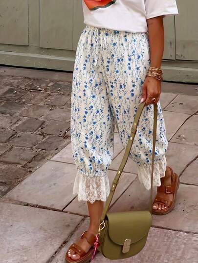 Flora Isola Flora Isola Women's Loose Fashionable Botanical Print Lantern Pants, Lace Patchwork Design, Casual Daily Commute, Travel & Holiday Minimalist Versatile Style