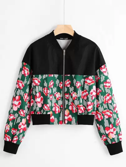 Dragkedja Färgblock Blommig Enkel Jacka - Multifärgad - Visa 4