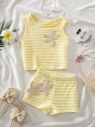 For Young Girl: Yellow And White Striped Sleeveless Top & Shorts Set With Starfish Details, Summer Refreshing Beach Style 2 Pieces Outfit
