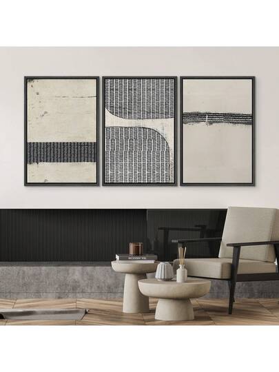 Framed Canvas Print Wall Art Set Black Tan Grunge Grid Polygon Pattern Abstract Shapes Cozy Neutral Decorative Contemporary Minimal For Living Room, Bedroom, Office - Multicolor - View 6