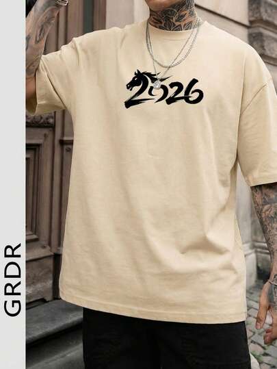 GRDR 2026 New Year Minimalist Horse Totem Print Short Sleeve T-Shirt, Comfortable & Breathable, Suitable For Summer, Leading Fashion - Apricot - View 1