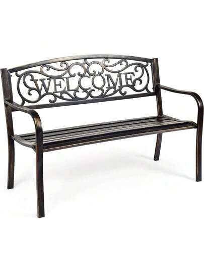 Particularities: An eye-catcher in every garden Beautiful pattern and "WELCOME" on the backrest Sturdy made of iron and steel High load capacity up to 320 kg Rust-resistant and weatherproof surface Ergonomic backrest and armrest Easy to clean with a cloth Detailed data: Color: Bronze Material: iron, steel Dimensions: 127 cm * 63.5 cm * 89 cm (L * W * H) Gross weight: approx. 15.9 kg Load capacity: max. 320 kg Delivery: 1 * Garden Bench