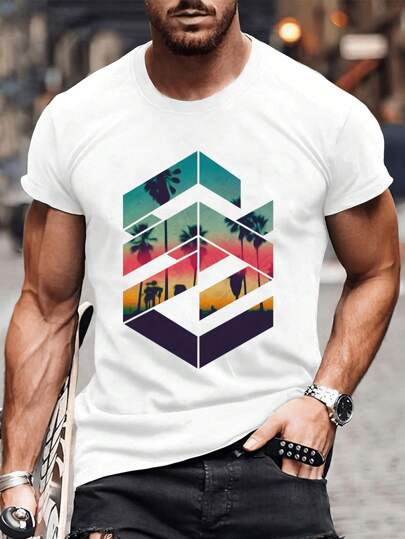 Geometrisk solnedgångsstrand herr-t-shirt med rund hals och kort ärm, avslappnad design - Vitt - Visa 1