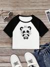 SHEIN Leap Crew Tween Girls' Casual Simple Panda Pattern Colorblock Raglan Short Sleeve T-Shirt, Summer