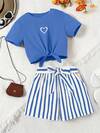 2pcs/Set Girl/Girls Casual Daily Graphic T-Shirt & Striped Printed Shorts Set, With Random Striped Belt