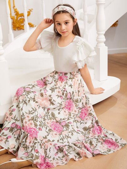 SHEIN Krås Hem Blommig Mönster Boho Flickors Kjol - Multifärgad - Visa 1