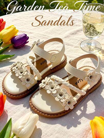 Girls' Summer New Sandals, Beige Woven Strap With Flower & Pearl Decor, Hook And Loop Design, Soft Sole Comfortable & Durable, Versatile For Daily Wear & Party, Flat Open Toe Sandals, Suitable For Elementary School Students