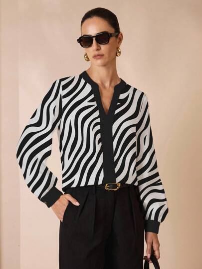 Glamance Pati Paints Elegant pendlar- och vardagsblus med zebratryck och långärmad V-ringning för kvinnor, topp för kontor, svart zebratryckt blus, zebratopp, randig blus, randig skjorta för kvinnor - Multifärgad - Visa 1