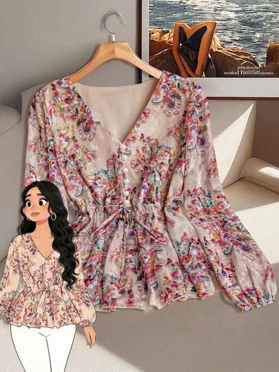 GlowEve CURVE Women's Plus Size Chiffon Cutout V-Neck Ruffle Sleeve Cinched Waist Elegant Blouse Fall Cloth For Women