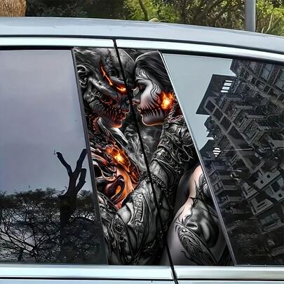 Gothic Flame Love 2pcs Vinyl Car Door Post Stickers - Black & White Skull Design, Easy To Apply & Remove, Sunproof & Waterproof, Scratch Protection, Unique Car Decoration For A Bold Look, Door Post Accessory | Dramatic Car Decor | Glossy Vinyl Stickers, Goth Car Accessories - A - View 5
