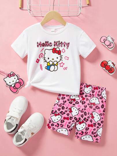HELLO KITTY AND FRIENDS | SHEIN Ung flicka 2st tecknad & leopardtryck T-shirt och Biker Shorts Set - Rosa - Visa 1