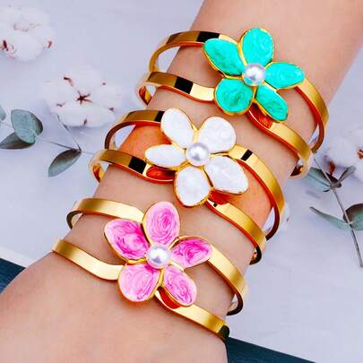Heavyweight Gilded & Vibrant Summer Oversized Bracelet | High-Quality Large Statement Jewelry - The Finishing Touch For Vacation Outfits - Plum Blossom Bracelet - View 1