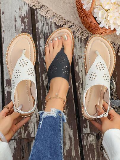 Hollow Out Beach Bohemian PU Leather Hollow Thong Sandals - Black - View 1