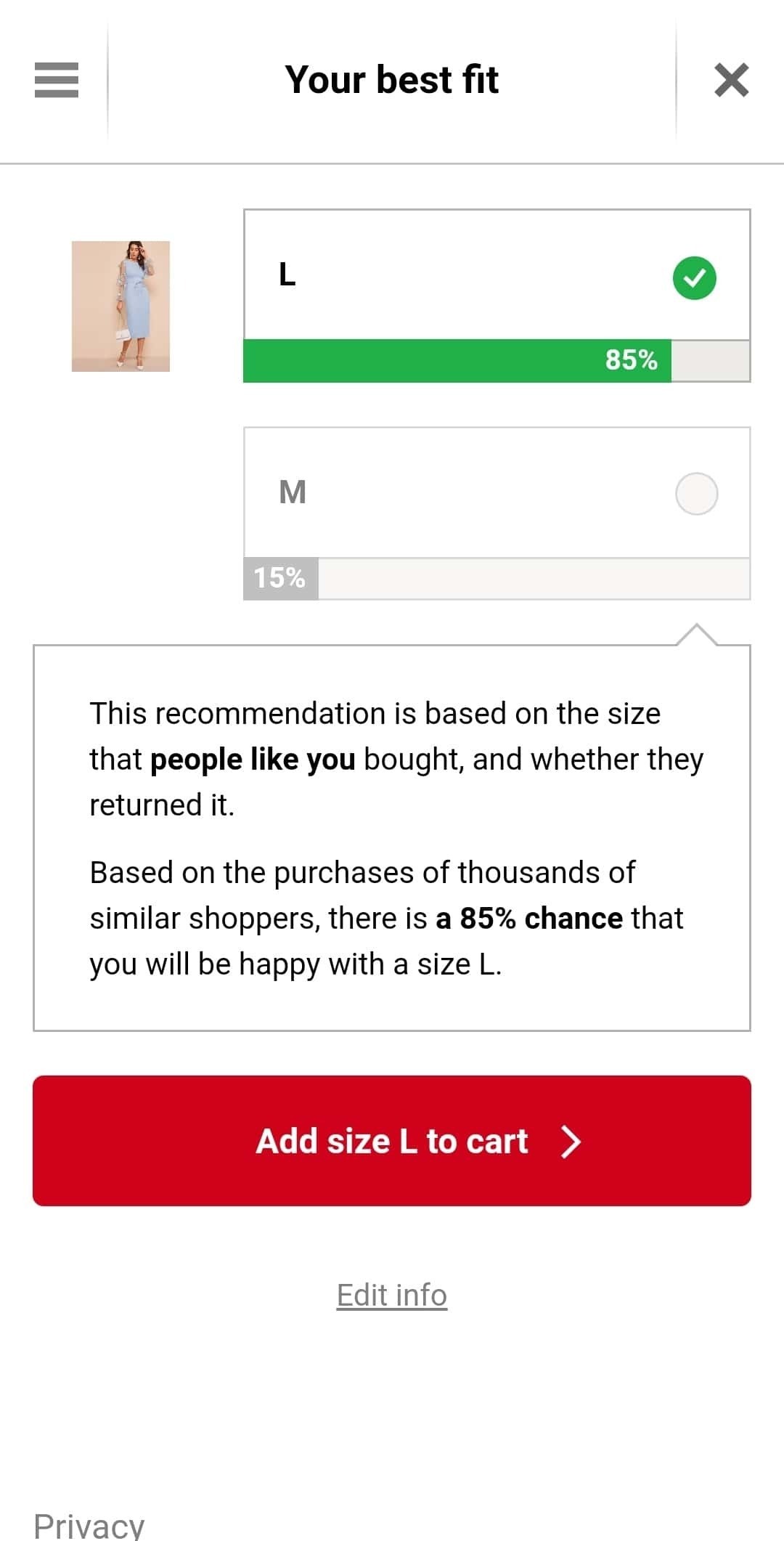 När du är inloggad ser du en storleksrekommendation på vissa produktsidor, som passar bäst i den information du har angett.