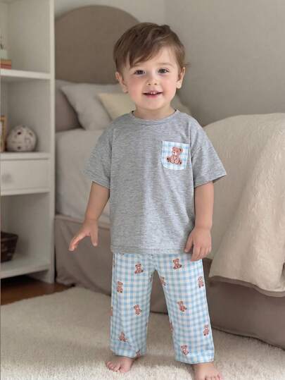 Infant Boy Korean Style Casual Cute Plaid Bear Graphic Pocket Tee & All-Over Bear Print Pants Pajama Set