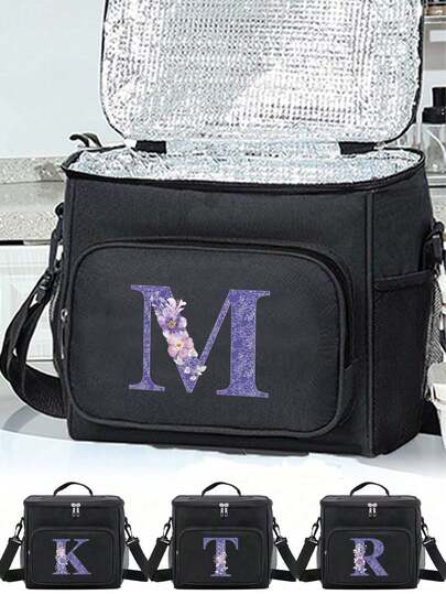 Insulated Lunch Box Bag Shoulder Canvas Bags Thermal LunchBox Initial Name A To Z Purple Letter Flower Printing Large Capacity Tote Bag For Women's Portable Work Food Storage Handbags Cooler Box For Office School Picnic Camping TravelLunch BagWomanFor Women LadiesSchool Supplies Stuff Accessories Bag For School School Accessories School Stuff - Black - View 1