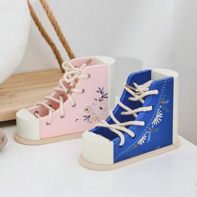 Kids' Wooden 3D Lacing Shoes Toy, Pink & Blue Cute Printed Design, Develops Hand-Eye Coordination & Creativity, Indoor & Outdoor Parenting Interactive Educational Tool