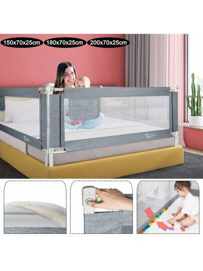 [Safe and well-designed children's bed rail] This children's bed rail is designed with rounded corners to minimize the risk of injury from accidental bumps. The mesh fabric is made of dur able material that is lightweight and water-repellent. The breathable mesh structure ensures that the view of your child is not obstructed, so you can keep an eye on your little one at all times. [Flexible height adjustment] The guardrail is height-adjustable and can be easily adjusted to the thickness of the mattress. Note: For box spring beds without a wooden substructure, it is advisable to use a thick mattress as screws cannot be inserted. [90° seamless design] The rail effectively protects your child from falling out of bed and at the same time prevents objects from slipping into possible gaps. [Practical storage bag] The fabric cover is easy to remove and clean. An integrated pocket offers space for small items such as towels, diapers, bottles and toys. [Universal Portable Bed Rail] The bed rail is easy to assemble and can be easily installed by one person. It is suitable for most types of beds such as double beds, leather beds, solid wood beds, children's beds and parent-child beds. It offers reliable protection for your child, whether at home or when traveling. Advantages: Height adjustable: flexibly adapts to different mattress thicknesses. Double lock mechanism with rounded corners: for stable and secure attachment. Breathable mesh: allows constant visibility of your child. Seamless 90 ° design: effectively protects against falls and ensures safety. With storage bag: practical storage space for children's toys, diapers and more. Technical specifications: Material: metal, linen, plastic Color: gray Height adjustable range: 70-93 cm Maximum mattress thickness: 30 cm Base extension: 25 cm Pocket size: 30x24 cm (for small items such as diapers and toys) Available sizes: 150 cm: net length 120 cm, height 45 cm, weight 3.35 kg 180 cm: net length 150 cm, height 45 cm, weight 3.60 kg 200 cm: net length 170 cm, height 45 cm, weight 3.75 kg Delivery includes: 1 x children's bed rail