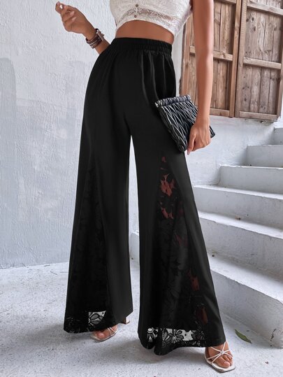 SHEIN Clasi Lace Insert Wide Leg Pants - Black - View 1