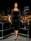 SOLERSUN Autumn And Winter Women's Wear Daily Commuter Elegant Velvet Mesh Splicing Black Velvet Knit Fabric Square Neck Long Sleeves Sexy Fit Bodycon Back Slit Midi Dress