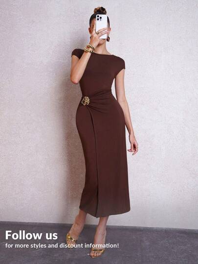 Lavishia Kvinnor metallknappar och vriddetalj midjeklänning, elegant rundhalsad långärmad Fritidsdaglig pendlingsklänning - Mockabrun - Visa 1