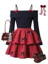SHEIN Sweetra Young Elegant ledig svart stickad lång klänning med asymmetrisk halsringning, axelavdragande veckad midja för tonårsflickor, sjöjungfrufåll, minimalistisk och graciös lång klänning