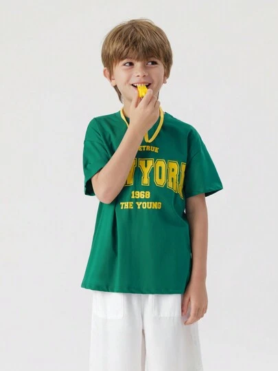 MARC&JANIE Young Boy Casual Sports American-Style Contrast Color Letter Print Round Neck Short Sleeve T-Shirt, Summer - Green - View 1