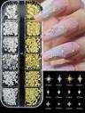1 låda med 12 rutnät, gnistrande gyllene silverstjärnor, nagelnitar - 3D-stjärnljus, fjäril, blomma, måne, legering, metall, nageltillbehör, nagelberlocker för naglar, nagelstenar