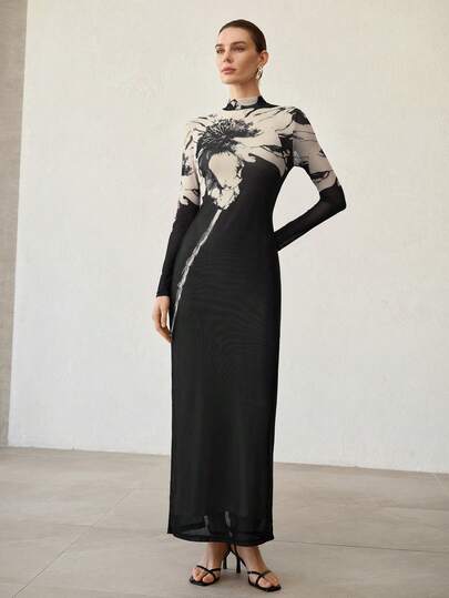 MOTF PREMIUM DAMKLÄNNING MED BLOMSTERMÖNSTER OCH SLITSADE UTSATS - Svart och Vitt - Visa 1